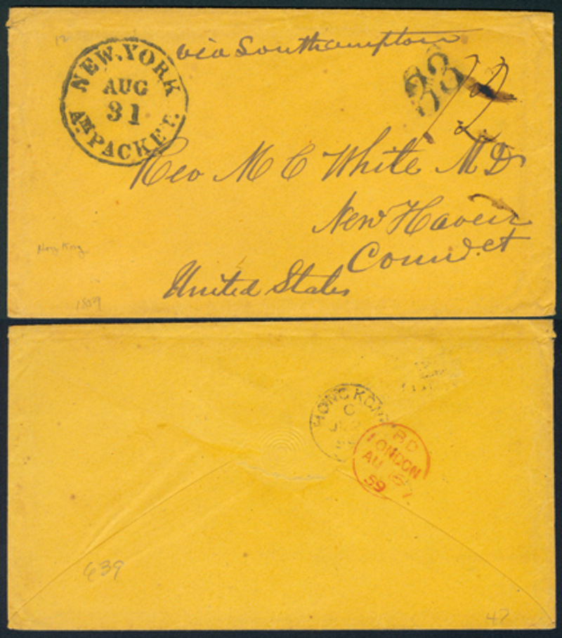 1852 (July) Cover from Hong Kong via Southampton to USA, bearing "33" handstamp and manuscript rate marking on front with New York Am Packet marking alongside, on reverse Hong Kong despatch and London transit cds.