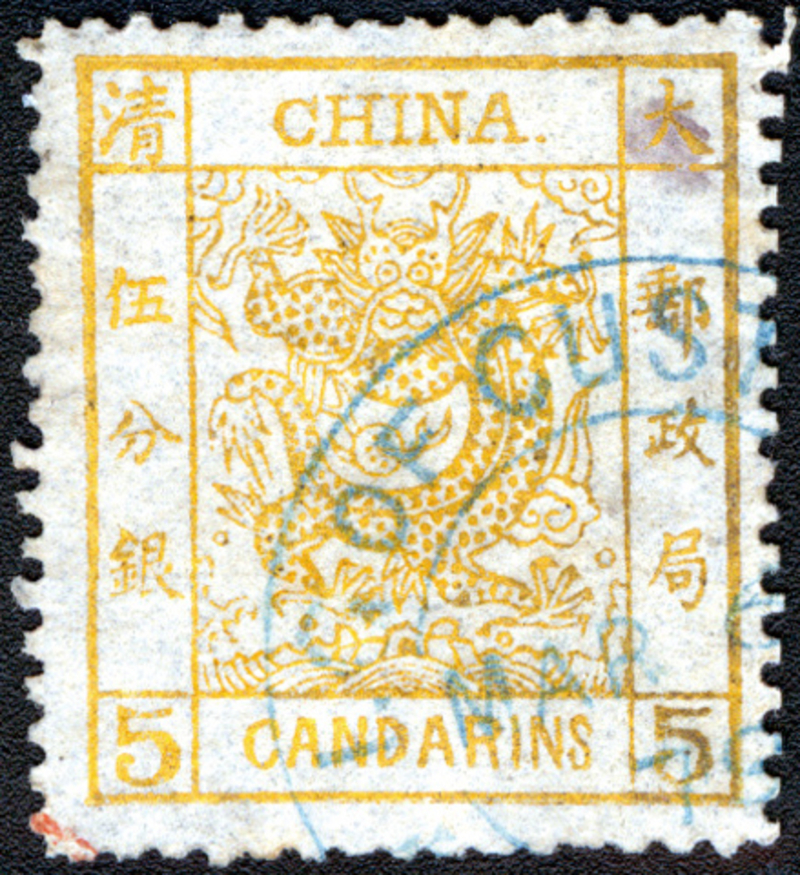 1878 Customs Large Dragons, thin paper printing, 5ca Orange (Chan 3; Scott 3), used with partial IG of Customs Peking "MAR 6 79" cds, scarce cancel on this issue.