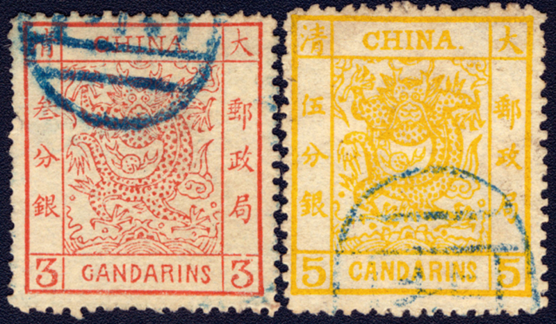 1883 Customs Large Dragons, thick paper printing with clean cut perforations (Chan 8-9; Scott 8-9), 3ca and 5ca, fine used with oval seal cancels (2).
