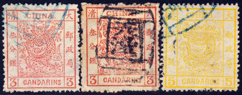 1885 Customs Large Dragons, thick paper printing with rough perforations (Chan 11-12; Scott 8a-9a), 3ca (two, one with clean cut perforation) adn 5ca, fair to good (3).