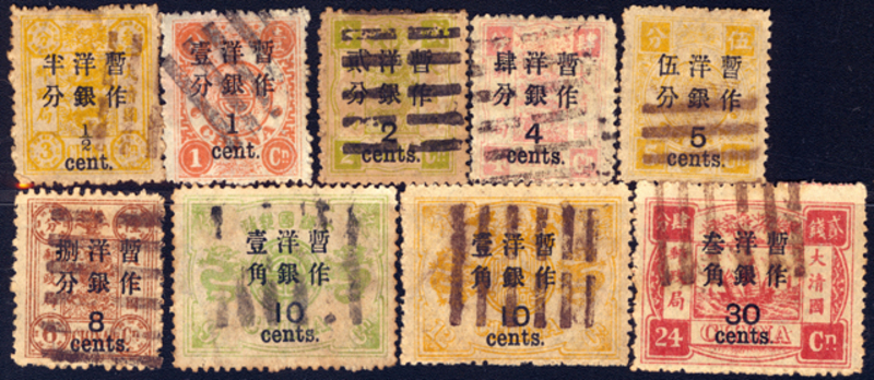 1897 Large Figure Wide Spacing Dowager Surcharges, second printing (Chan 56-64; Scott 47-55), complete set of nine, used with pa kua cancels (9).