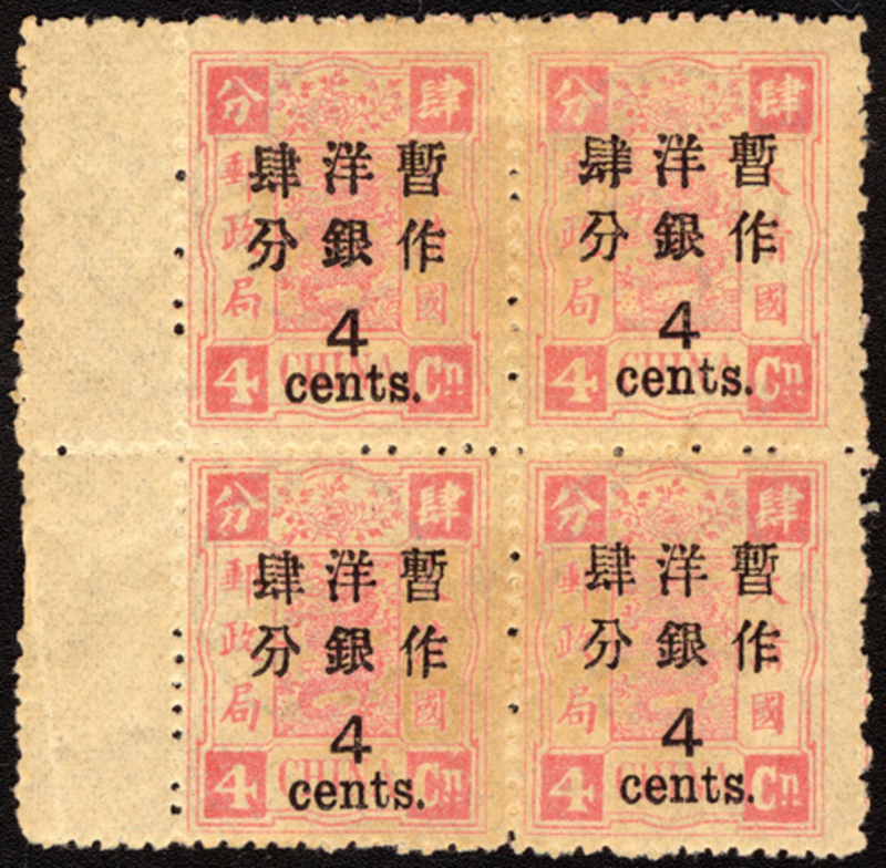 1897 Large Figure Wide Spacing Dowager Surcharges, second printing, 4c on 4ca Pale rose, incorrect "Four" of surcharge (Chan 59b; Scott 50), fresh mint block of four, top right stamp with error (4).