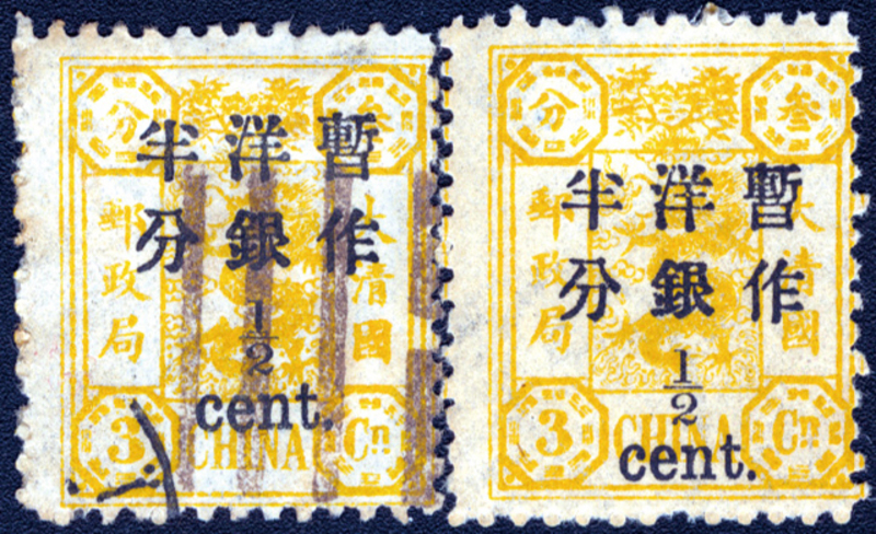 1897 Large Figure Narrow Spacing Dowager Surcharges, first printing, ?c on 3ca Orange yellow (Chan 65; Scott 56), mint and used examples, very fine.