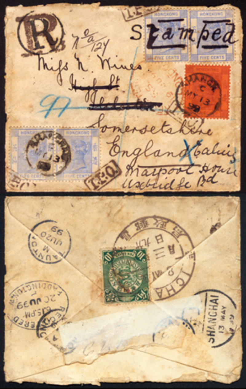 1899 (May 8) Registered Cover from Ichang to Somersetshire, franked on reverse with CIP 10c, tied by Ichang dollar dater, Shanghai transit with Paddington registration handstamp and Taunton arrival cds alongside, on front Hong Kong QV 5c (2 horizontal pairs) and 10c canceled by IPO tie-prints with two overlapping registration handstamps, a very rare example of BPO stamps accepted by Ichang Post Office as well as a very late and possibly the latest recorded use of the Ichang dollar dater.
