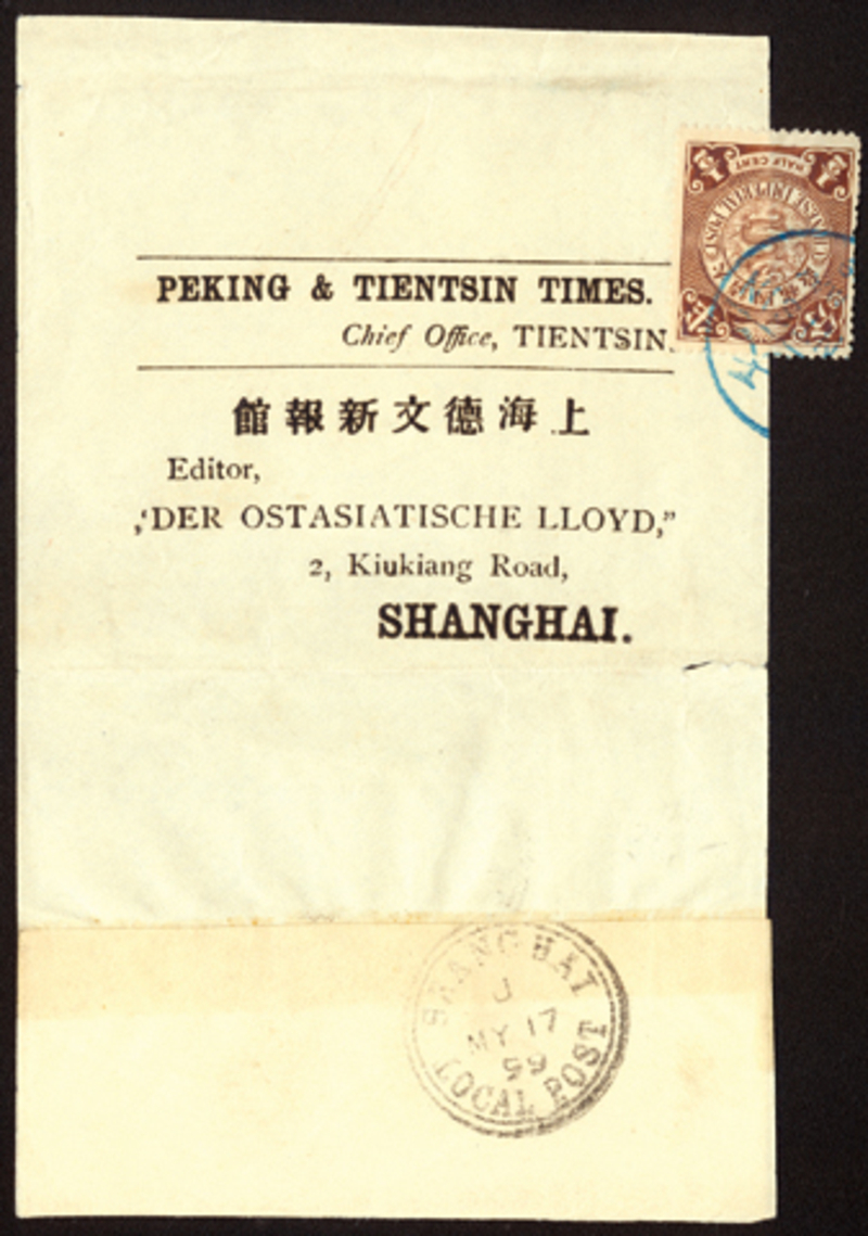 1899 (May 17) Newspaper Wrapper from Tientsin to Shanghai, franked with CIP ?c tied by Tientsin bilingual dater, on reverse Shanghai Local Post arrival cds.