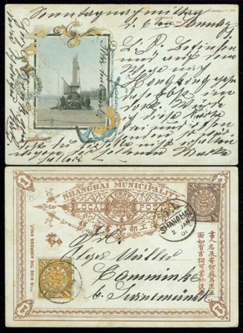 1901 (January 2) Shanghai Local Post 1c Postal Card, up-rated with CIP ?c & 1c, tied by Shanghai bilingual daters.