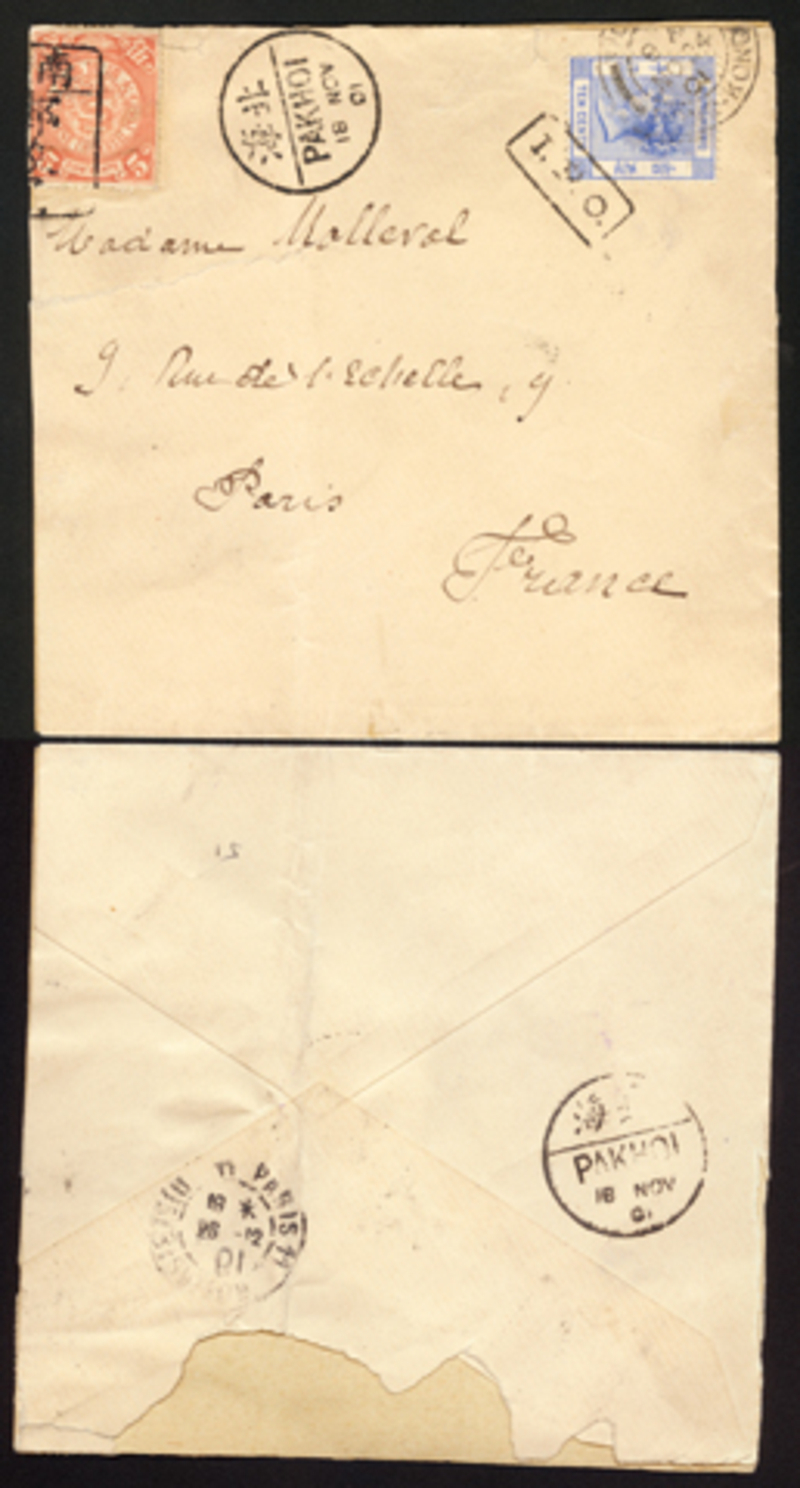 1901 (November 18) Pakhoi IPO Combination Piece, bearing CIP 5c (reduced at left) tied by tombstone handstamp, Hong Kong QV 10c added with IPO tie-print, Pakhoi bilingual dater alongside.