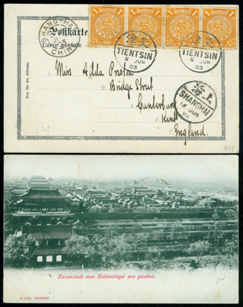1903 (June 8) Picture Post Card from Tientsin to England, franked with CIP 1c(4), canceled by bilingual daters, Shanghai Chine transit cds alongside.