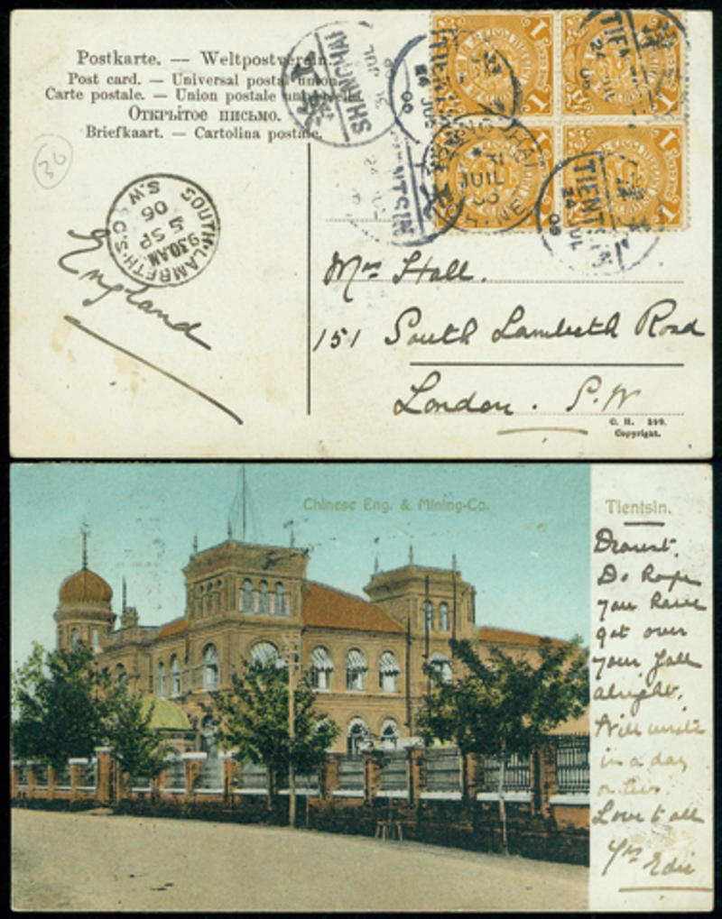 1906 (July 24) Picture Post Card from Tientsin to London, franked with CIP 1c(4) canceled by bilingual daters, Shanghai transit and London arrival cds alongside.