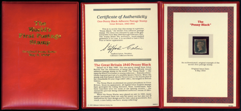 GREAT BRITAIN: 1840 Penny Black, good margin example with corner letters "LG", housed in presentation folder with certificate of authenticity issued by Calhoun's Collectors Society in 1983.