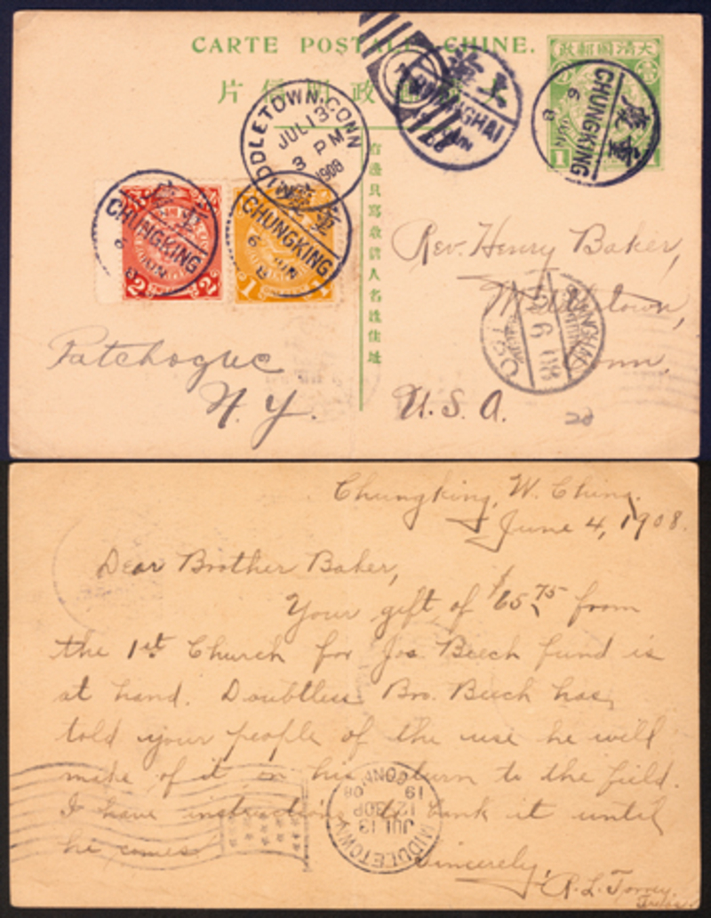 1908 (June 6) CIP 1c Green Postal Card from Chungking to USA, up-rated with CIP 1c & 2c, canceled by Chungking bilingual dater, Shanghai bilingual dater alongside with Middletown Conn arrival cds.