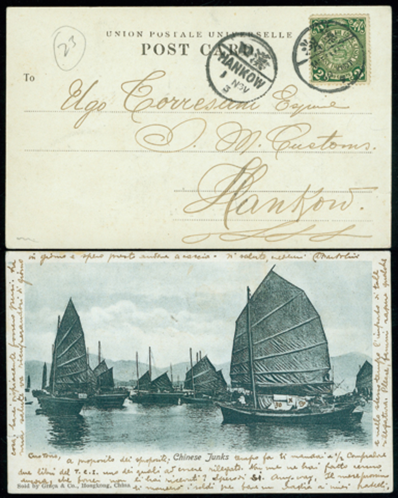 1909 (datelined October 30) Picture Post Card (depicting Hong Kong) from Wuhu to Hankow, franked with CIP 2c and tied by bilingual dater, Hankow arrival cds alongside.