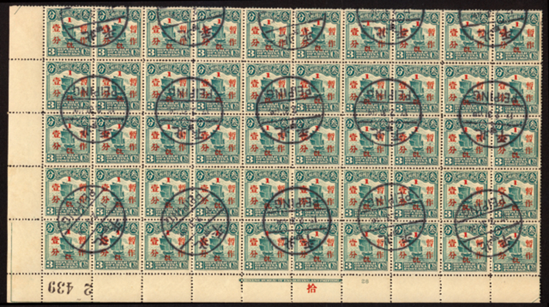1930 Surcharge on First Print Junk Series 1c on 3c Blue green (Chan 282), block of 50 with bottom imprint and control number, CTO (50).
