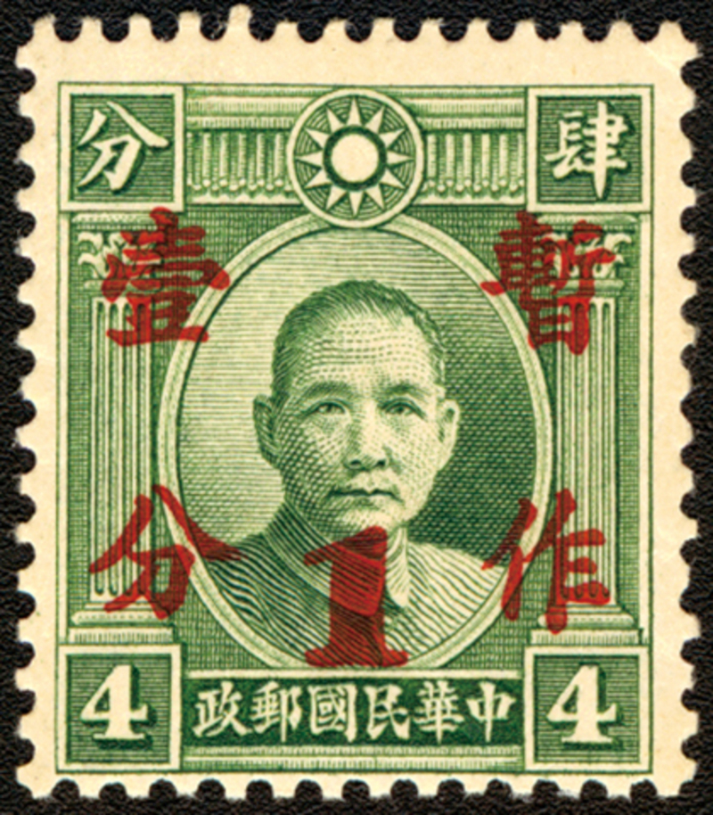 1937 Surcharge on Dr SYS (London 2nd Print) 1c on 4c Wide Stamp Type B Variety (Chan 363; Scott 341var), extremely rare item, mint.
