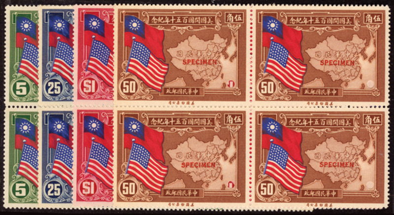 1939 150th Anniversary of the US Constitution (Scott 364-367s), complete set of 4 in blocks of four, bearing "Specimen" overprints in red and small security punch hole at bottom right, UM.