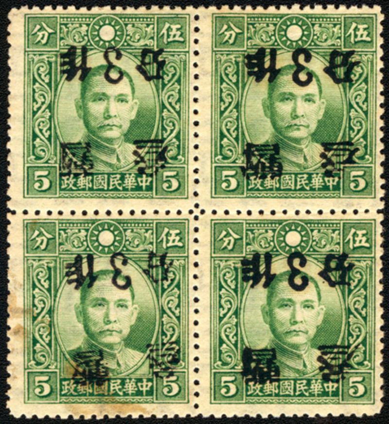 1940-41 Kansu 3c on 5c Dr SYS Dah Tung Print, block of four with surcharge inverted variety, unlisted in Scott and Chan, usual gum toning.