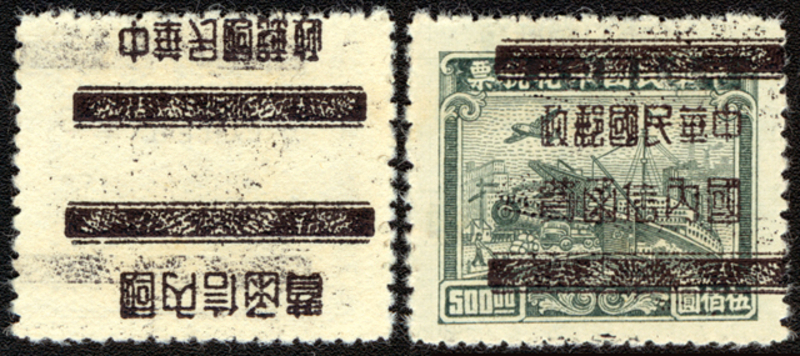 1949 Kwangtung Silver Yuan Unit Postage Overprint on Revenue Issue $500 Dark green (Scott 962var), overprint inverted and misplaced on reverse variety, unused.