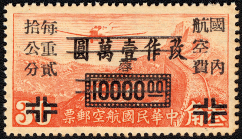 1949 Air Mail Unit Stamp, West Szechwan Overprint on $10,000 on 30c Red Hong Kong Print Air Stamp, Watermarked (Chan SA3), mint with original gum, scarce.