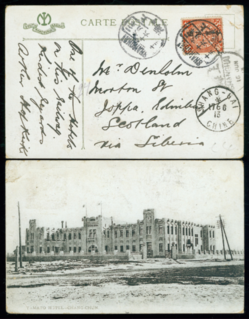 1913 (June 16) Picture Post Card (depicting Yamato Hotel in Changchun) from Shanghai to Scotland, franked with CIP "Republic" overprint 4c, canceled by "2nd Year" cds, Shanghai Chine and bilingual dater alongside.