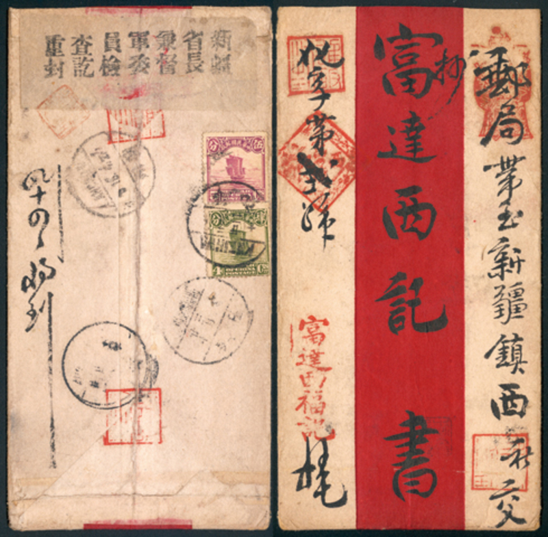 1920's Red Band Cover to Sinkiang, franked with Junk 4c & 5c, Lanchow transit and Sinkiang censor tape at top.