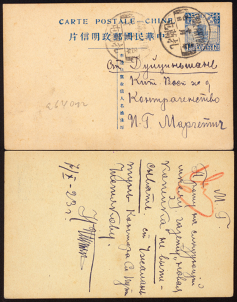 1923 (October 7) Junk 1?c Postal Card from Chalanton to Russia, tied by Chalanton cds, rare postal card usage from Mongolia, very few recorded.