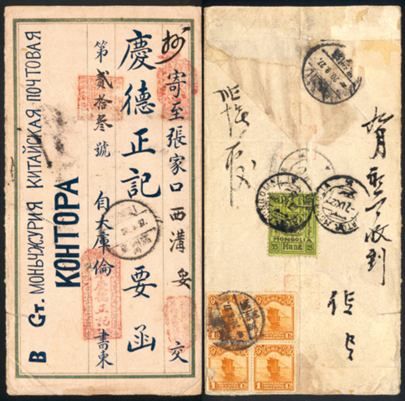 1927 (September 7) Printed Native Cover from Urga to Zhangjiakou, franked on reverse with 25M, canceled by Ulanbator cds, Junk 1c block of 4 (bottom left stamp damaged) added and canceled in Manzhouli.
