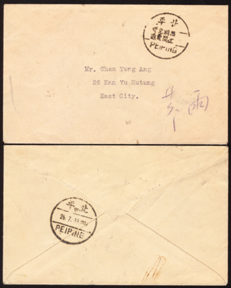 1930 Plain Local Cover, bearing on front 30mm Peiping (postal strike period, free delivery) round chop, on reverse Peiping cds.