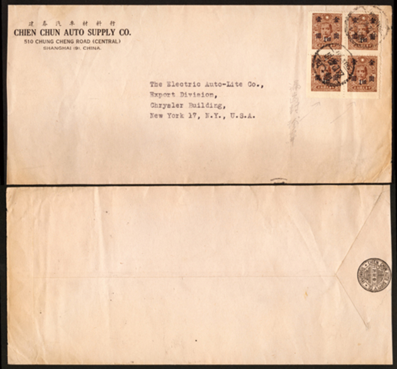 1948 (December 23) Gold Yuan Cover from Shanghai to USA, franked with Dr SYS $1 on 30c Dr SYS block of four, bottom pair with imperforate variety, scarce usage on cover.