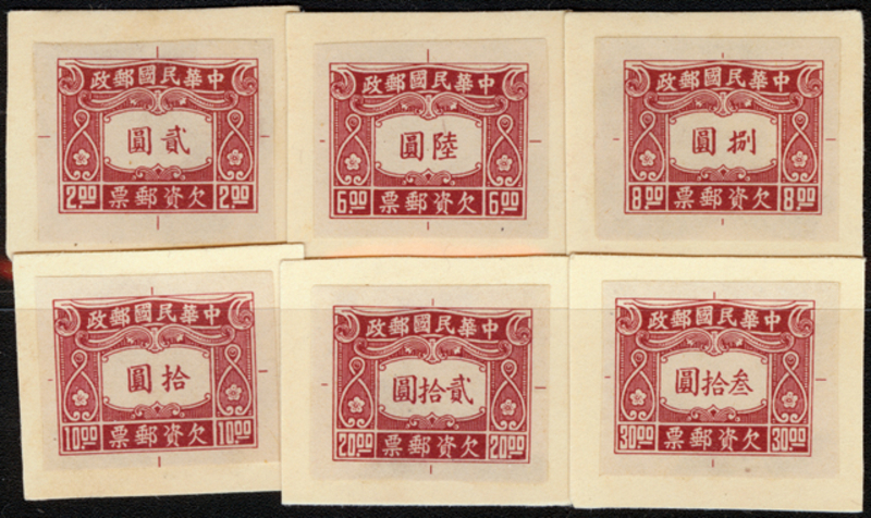1945 Second Central Trust Print Postage Due Stamps (Chan D93-98), complete set of 6 proofs, mounted on card, scarce.