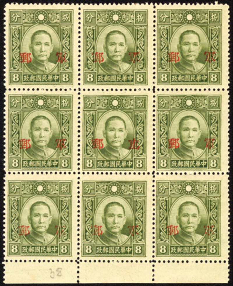 1942 "Military Post" Chekiang Overprint in Red on Dr SYS (Dah Tung Print) 8c Olive green (Scott M11a), bottom marginal block of 9, middle stamp with character "Military" inverted variety, UM.