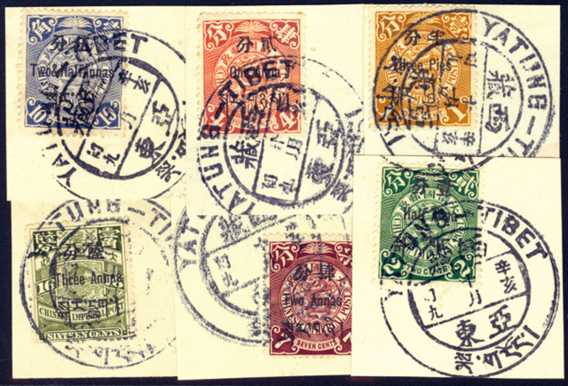 1911 Imperial Post Offices in Tibet 3p to 3a (Chan T1-T6), six values used on piece tied by Yatung-Tibet dollar dater, very pretty group.
