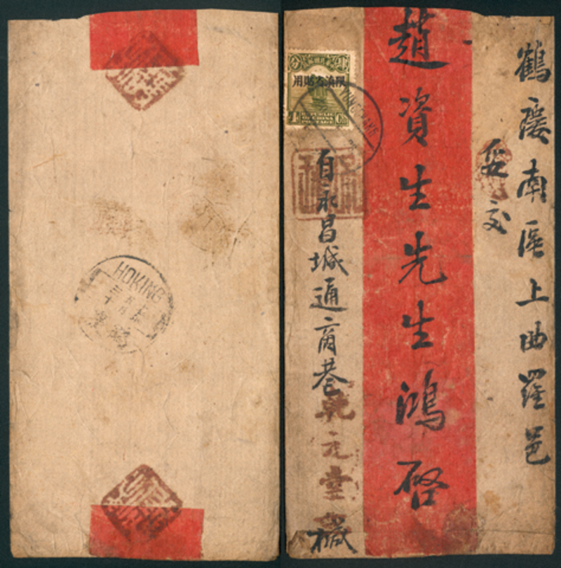1928 Red Band Cover from Yungchang to Hoking, franked with "Limited for Yunnan Use" Junk 4c, canceled by Yungchang cds, on reverse Hoking arrival cds, scarce usage.