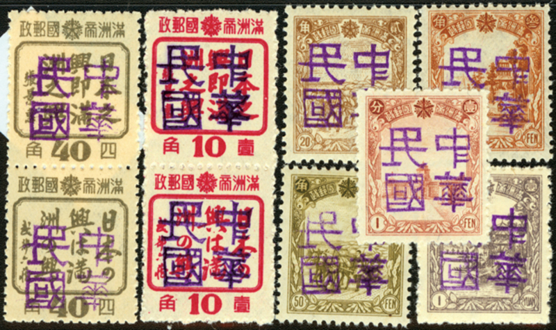 Local Overprints of North-eastern Provinces, Sze Fang Tai (Kerr 207.1-9), hard purple antique character "ROC" overprint set of 9, 10f & 40f in horizontal pairs, UM.