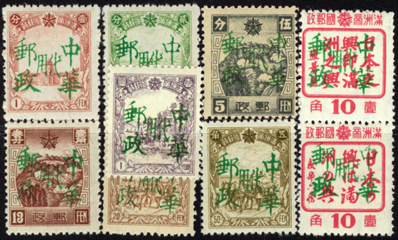 Local Overprints of North-eastern Provinces, Wei Ho (Kerr 254.11-19), hard green character "China Postal Service Temporary Use" overprint set of 9, 10f in horizontal pair, UM.