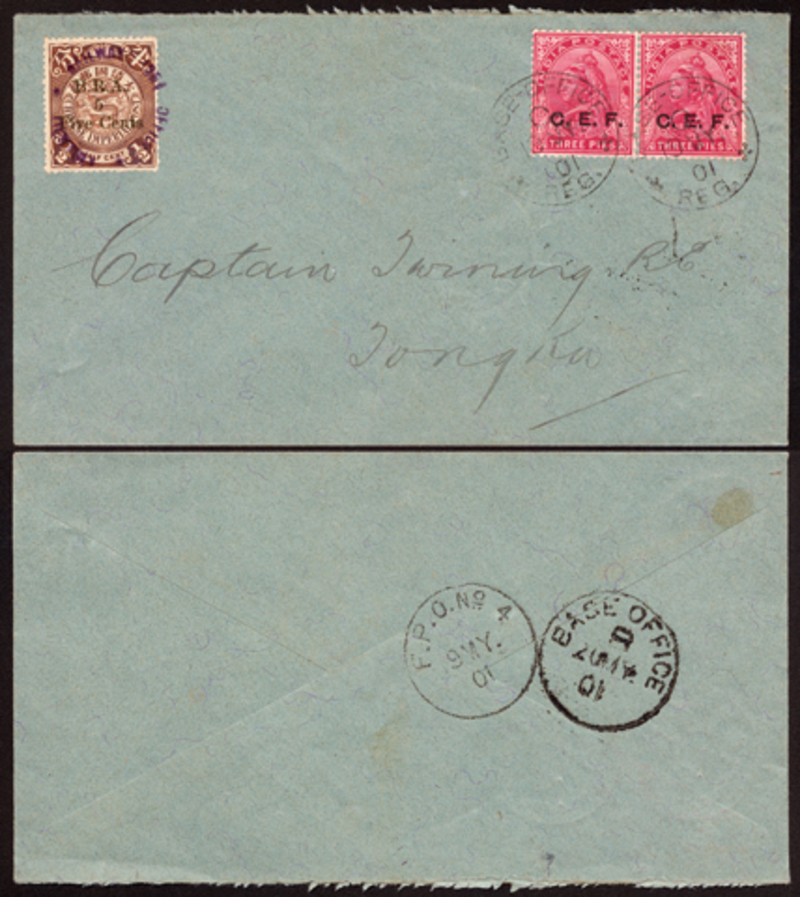1901 (May 19) Plain Green Cover Addressed to Captain Twining at Tongku, franked on front with CEF overprint India QV 3p Carmine pair, tied by Base Office cds, Green BRA 5c CIP added at left and canceled by Railway PO Tientsin round chop in violet, on reverse FPO No 4 arrival cds, a late letter service charge was introduced on April 20, 1901, BRA 5c was used for the collection of the 5c late fee and can only used in combination with CEF stamps, this late fee charge was abolished on May 20, 1901 and BRA 5c stamps were then withdrawn.
