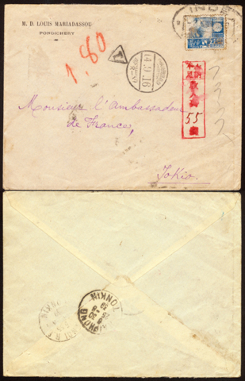 JAPAN: 1939 (August 2) Postage Due Cover from Pondochery to Tokio, franked with Japan 20s, tied by oval Inde cds, triangular "T" handstamp and vertical boxed Japanese postage due marking in red, Hanoi and Haiphong transit cds on reverse, Japan Postal Insurance Office arrival cds, rare.