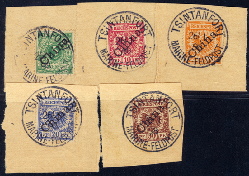 1898 Diagonal "China" Overprint on Germania Eagle Issue (SG 2-6), group of five, value 5pf to 50pf, fine used on piece, canceled by Tsintanfort Marine Feldpost cds, rare set.