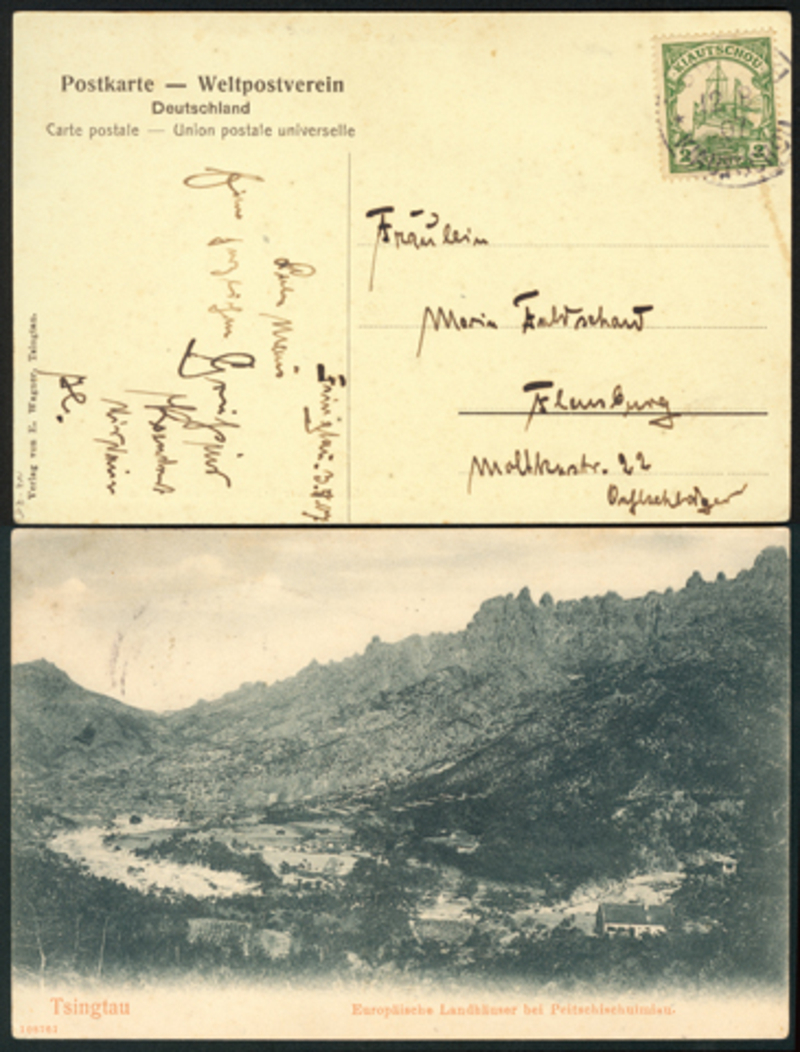 1907 (August 12) Picture Post Card from Tsingtau to Germany, bearing Kiaochow 2c Green.