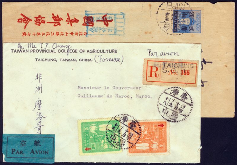 1953-54 Pair of Taiwan Covers, one registered air mail from Taichung to Morocco, the other Taipei local usage, postal advertising handstamp on back with reversed example on front.