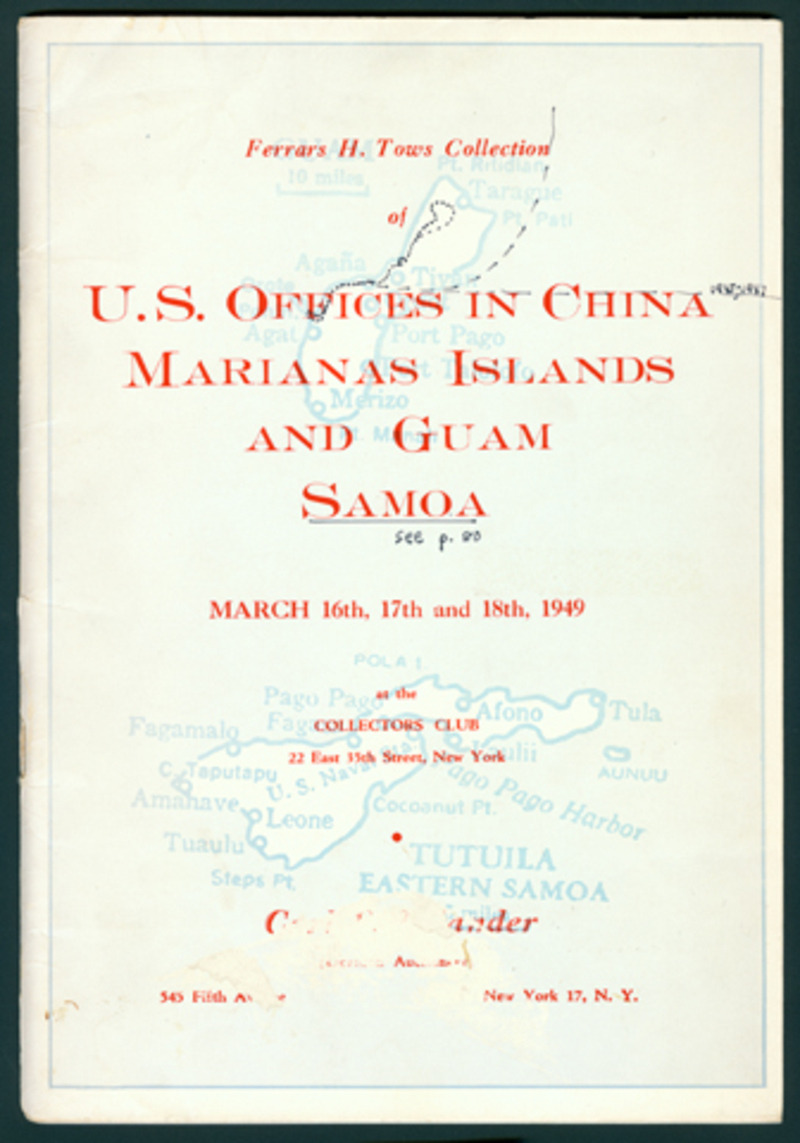 1949 (May) US Post Offices in China, Ferrars H Tows Collection, includes precancels and overprinted Shanghai issues, Carl E Pender (New York), with prices realised, some notations and damage to front cover.