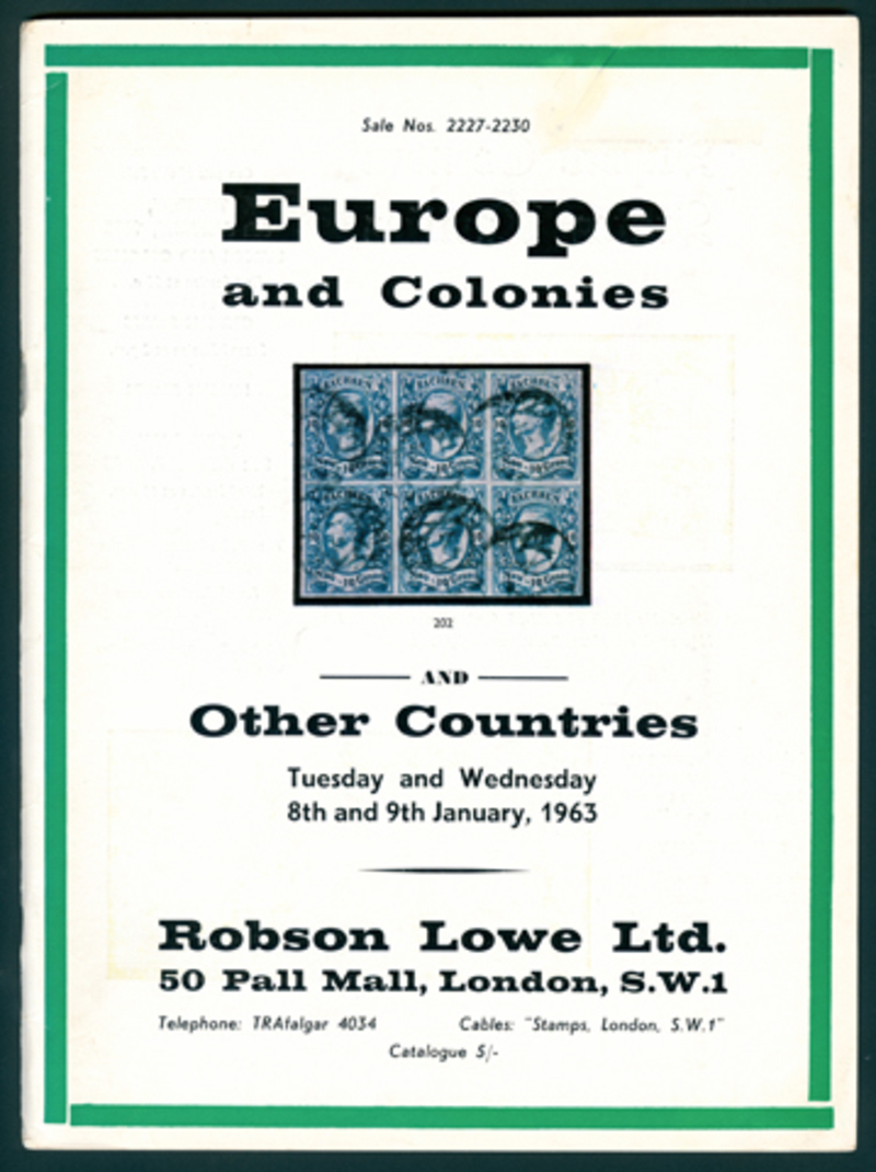 1963 (January 8-9) Europe and Colonies and Other Countries, Robson Lowe (London), with prices realised, includes part of the Sir Percival David collection with Municipal Posts and Formosa.