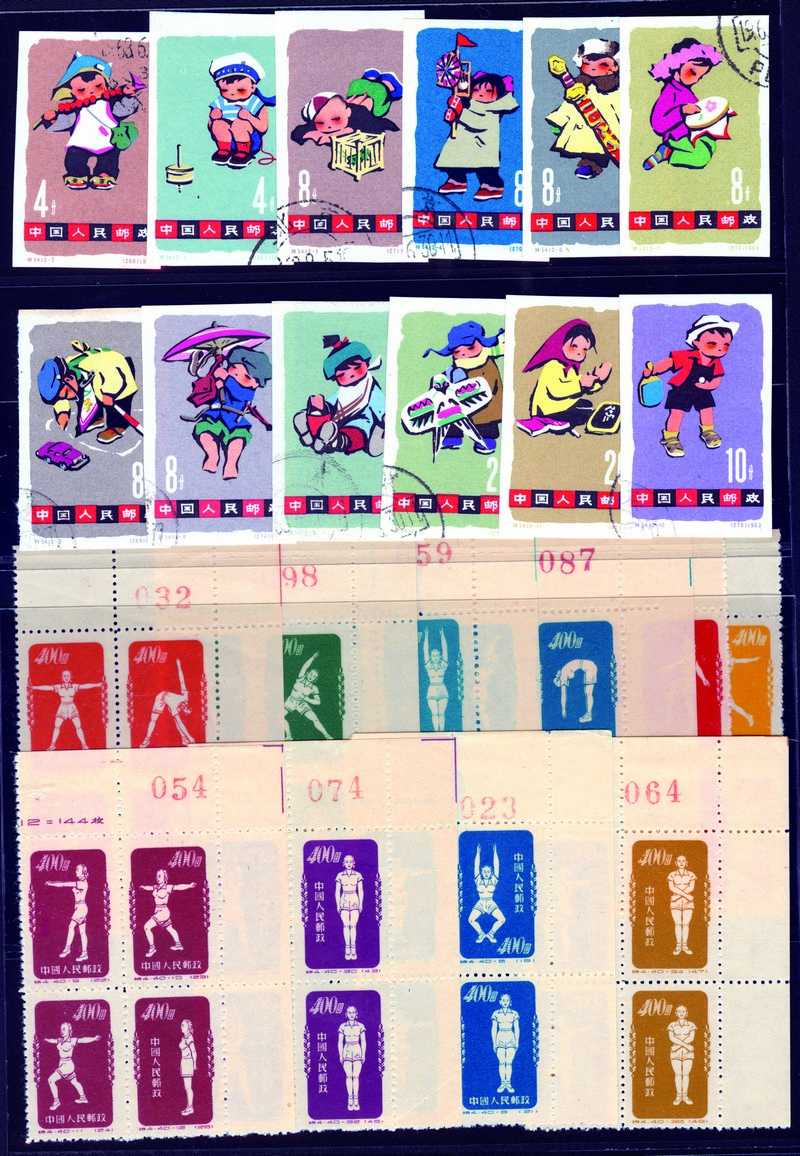 PRC 1952-63 Gymnastics & Children (Yang S4 & S54), S4 in unused blocks of 4 (reprints) and S54 CTO set of 12, hinged and fine.