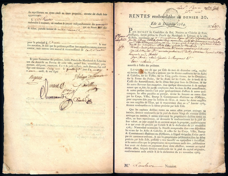 FRANCE: 1764 (December) A Royal Government Loan, in repayment of "Rentes sur les Aides & Gabelles" (annuity issued against salt tax revenues), dated 1765, black printing, 4 pages with paper "quittance" (receipt) attached with string as is usual, very fine and a good example of early French Government finance document.