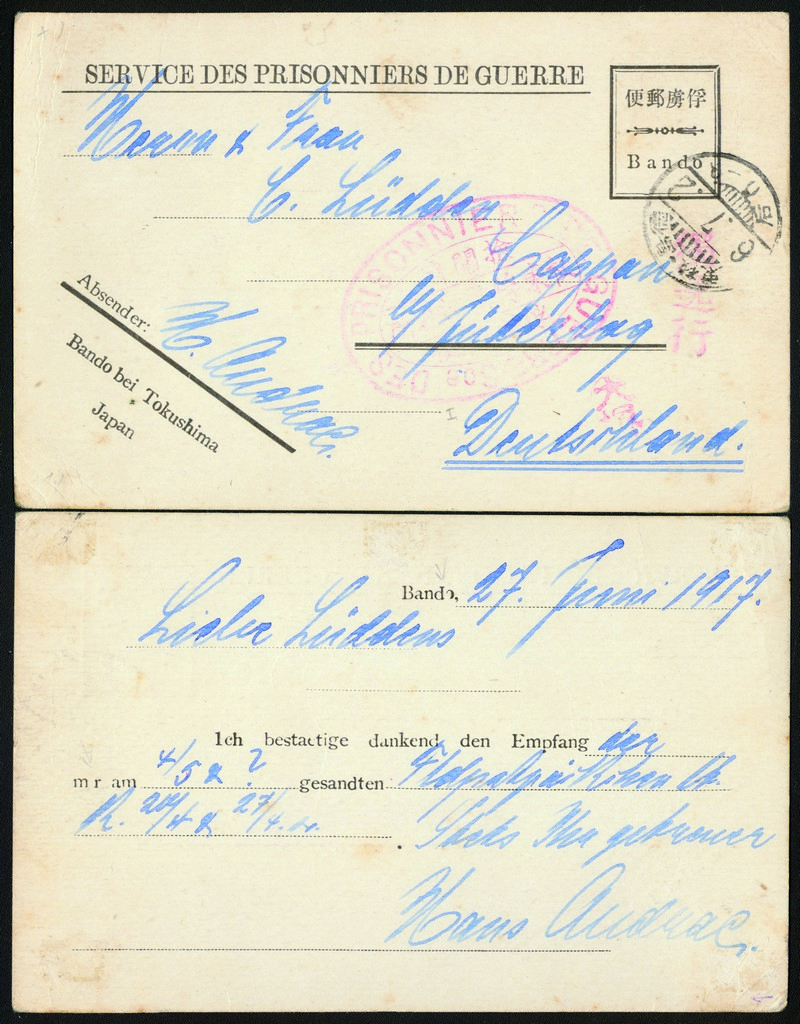 JAPAN: 1917 (July 6) Prisioner of War Post Card from Bando Tokushima Camp to Germany, bearing oval censor marking in red, fine.