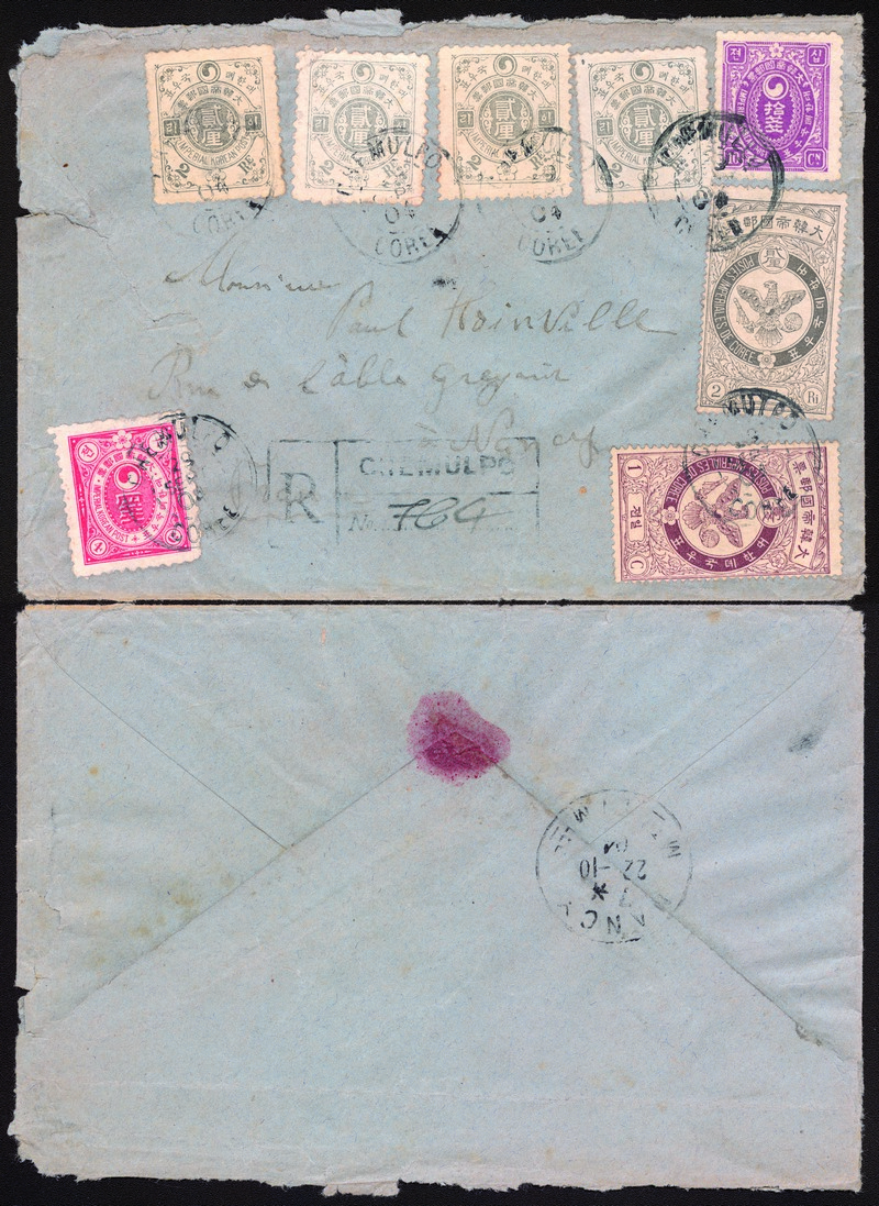 KOREA: 1904 (September 29) Registered Cover from Chemulpo to Nancy, franked with 2Re(4), 4Cn, 10Cn, 1C & 2Ri, all tied by Chemulpo cds, rectangular boxed registration handstamp alongside, on reverse Nancy arrival cds.