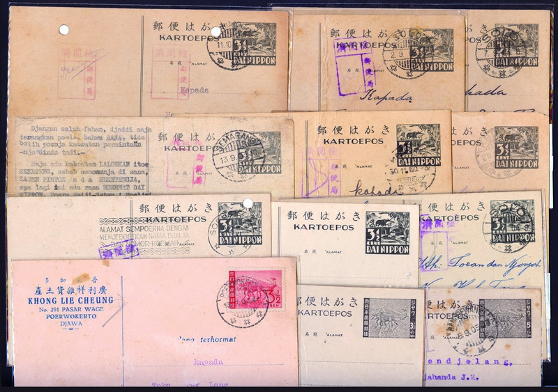NETHERLAND INDIES: 1943-45 Japanese Occupation Period Postal Stationery Cards, group of 13, including three unused (all different designs) and ten used, mostly commercial usage bearing despatch cds and censor chop, condition mixed (13).