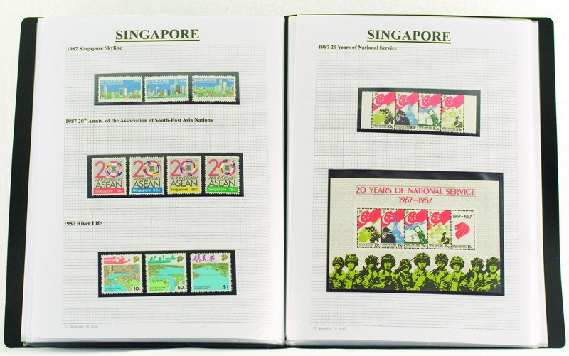 SINGAPORE: 1970-89 Mint Collection, including commemorative and definitive issues, total 400 stamps with 21 M/S mounted on leaves in clear folder, better items include '71 Satellite & Singapore Festival MS, '72 Shipping MS, '73 Sports MS, '74 Children's Day MS, '85 Insects & '90 Tourism definitives, etc, all in complete sets, mostly fine UM (hundreds).