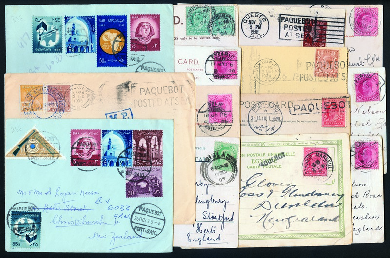 WORLDWIDE: 1904-38 Range of Paquebot Covers and Cards, all postally used to foreign countries, five franked with GB stamps, six with Indian stamps, two with Egyptian stamps & one with Brazilian stamps, canceled by various types of paquebot chops (14).
