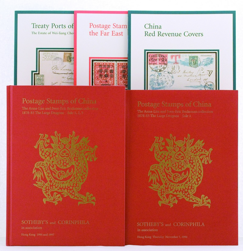 LITERATURE: 1996 (November 7) Sotheby's in Hong Kong, set of 5 including Treaty Ports of China (The Estate of Wei-Liang Chow), Postage Stamps of the Far East, China Red Revenue Covers and The Beckeman Collection of Large Dragons Sale I with handbook (5).