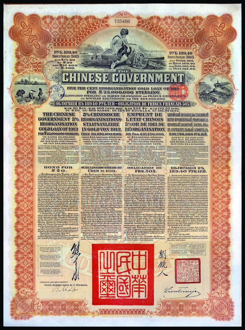 BONDS & SHARE CERTIFICATES: 1913 Chinese Government 5% Reorganization Gold Loan, bond for GBP20, serial number 735486, Russian issue, "Mercury" at top, peasants and buildings at either side, brown and black, printed by Waterlow & Sons, with coupons, very fine.